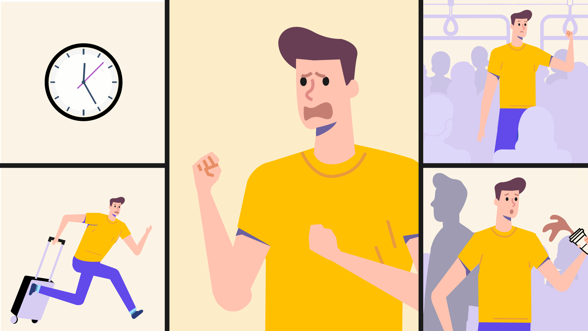 To make the psychological concept of trigger stacking instantly understandable, the design leaned into a clean, flat, infographic-style animation. We opened with a highly relatable human scenario a hectic morning commute involving running late, a full bus, spilled coffee, and a dying phone before bridging that exact feeling of frustration directly to canine stress.